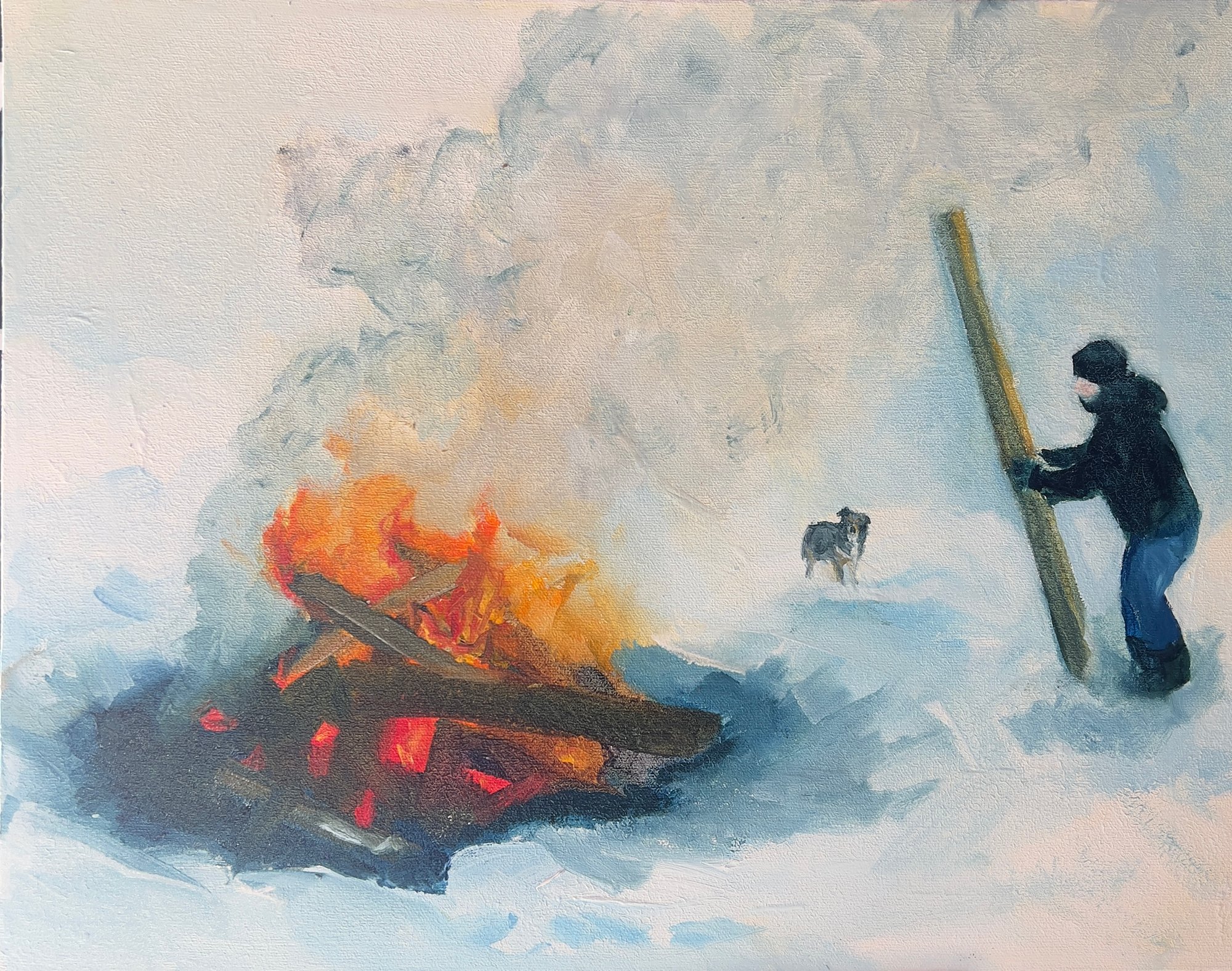 For many years, since driving past a working bonfire in the middle of a snowy, foggy field one February, I've imagined a painting of a big bonfire in the snow. That day I didn't stop to sketch- it was long before cell phone cameras.